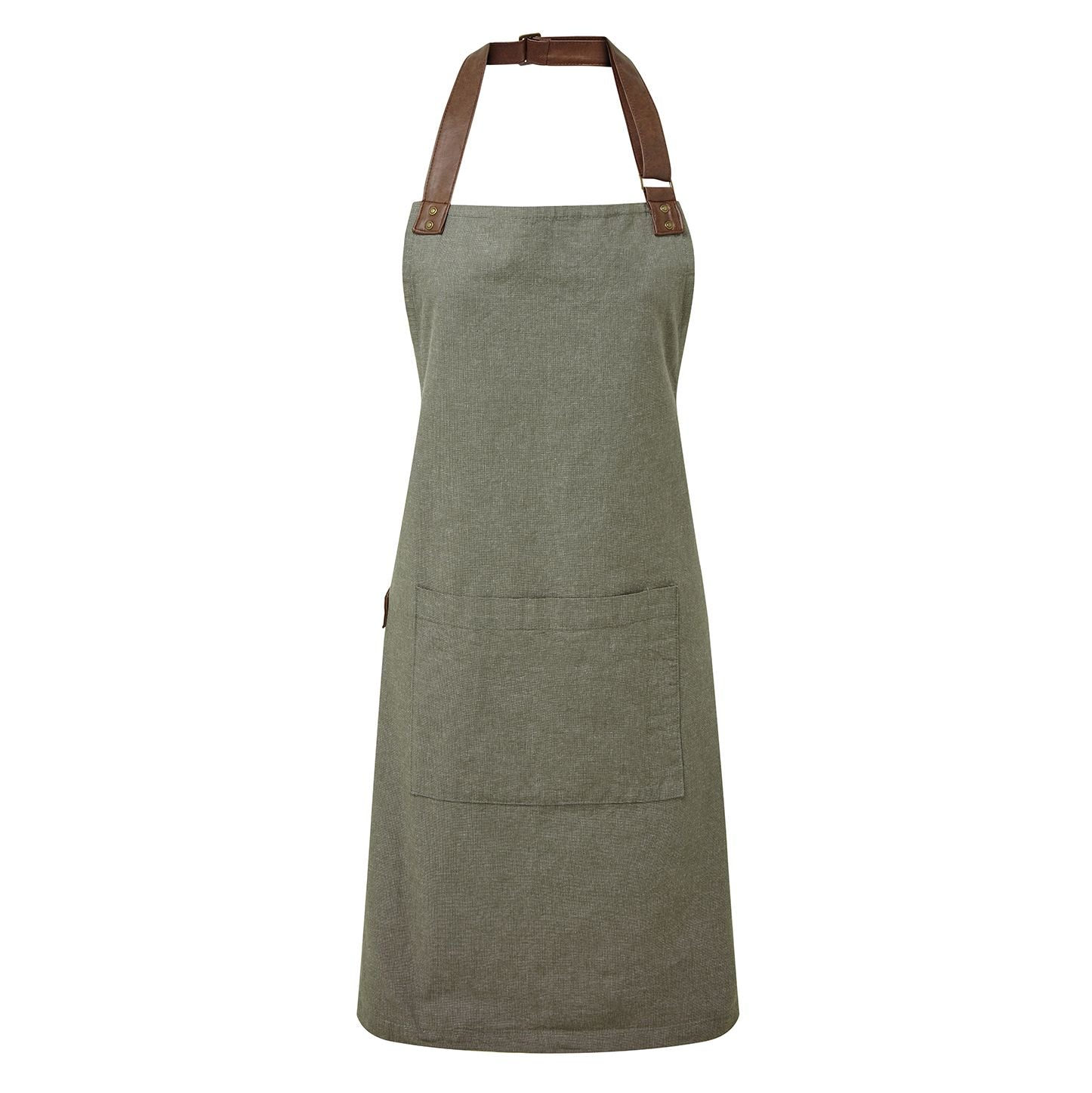 An attractive bib apron using yarn-dyed cotton threads that are woven together to create a pleasing contrast effect. To the centre lies a tablet-friendly pocket with combined pen pocket. A self-fabric tie can be looped through and secured in place using a double D-ring at the waist. Faux leather fabric features for decoration and practicality finish off this stunning apron.
