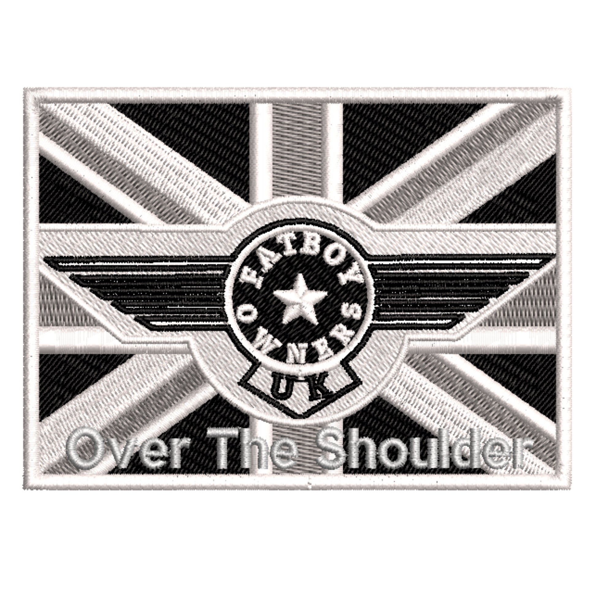 This is an embroidered badge of the Fatboy Owners - Over The Shoulder club logo at 15cm wide.