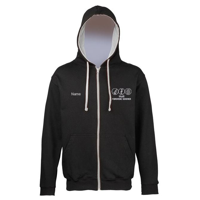 Logo is embroidered onto the left chest, with an option to add the name to the right chest. This hoodie also has Forensic printed on the back in white.