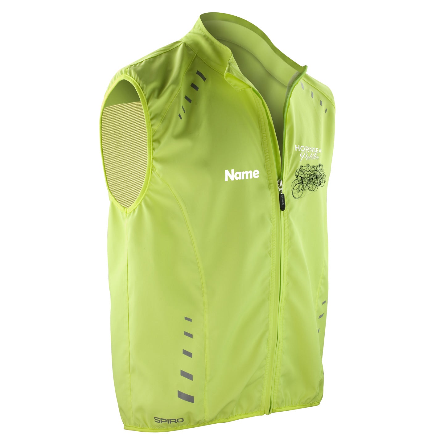 Spiro bikewear crosslite gilet with Hornsea Peloton logo printed on the left chest. You can also personalise this product with your name on the right side and with the logo printed on the back.
