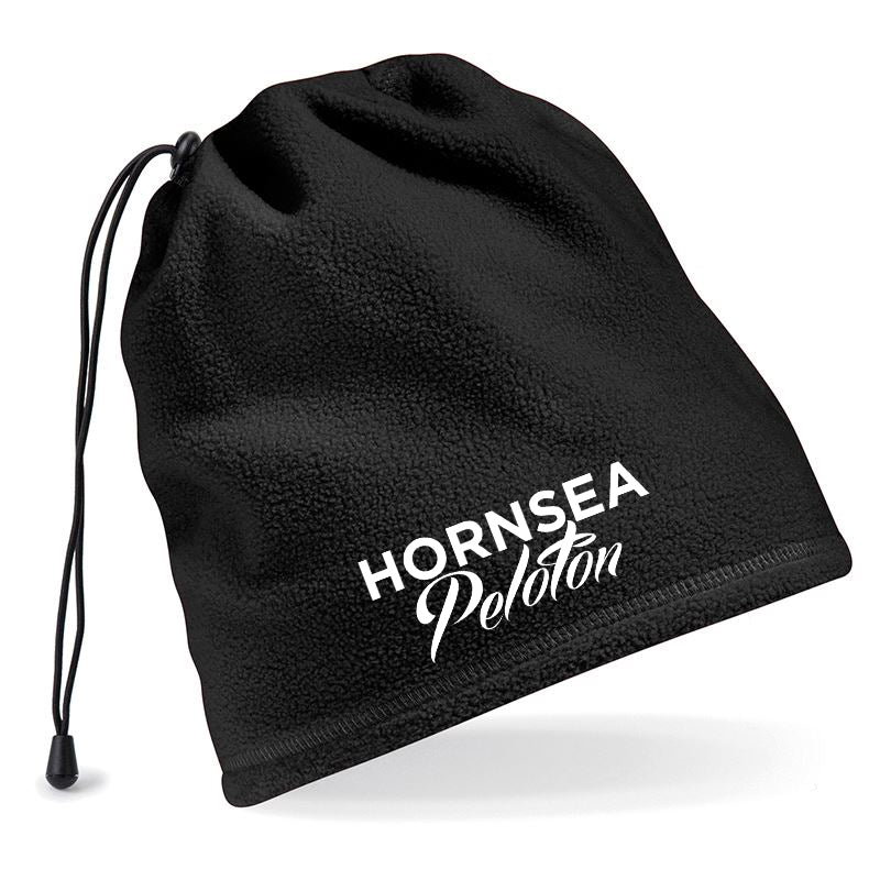 Hornsea Peloton Suprafleece snood/hat combo with the Hornsea Peloton text embroidered on.