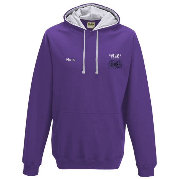 Varsity two colour hoodie with Hornsea Peloton logo embroidered onto the left chest. You can also personalise this product with your name on the right side and an addition logo print on the back is optional.