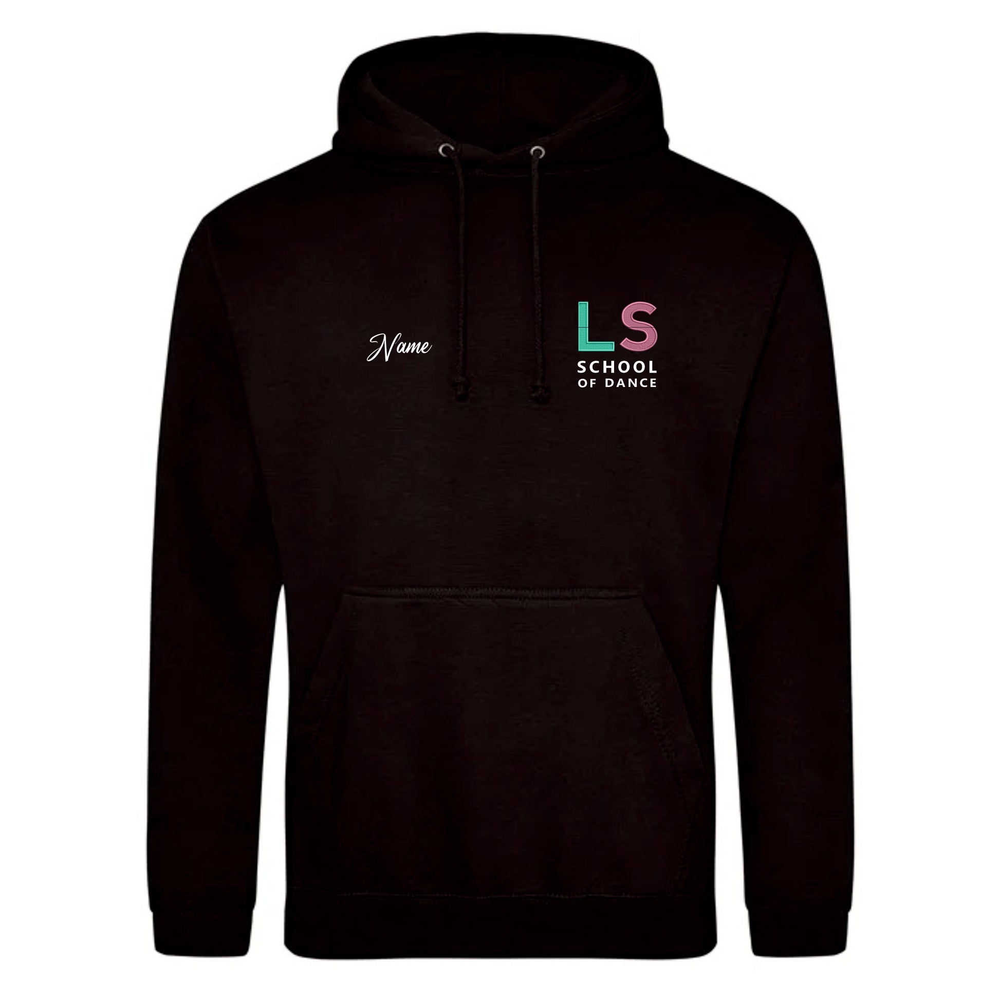 Black adults pull over hoodie with LS Dance logo embroidered on the front and back.
