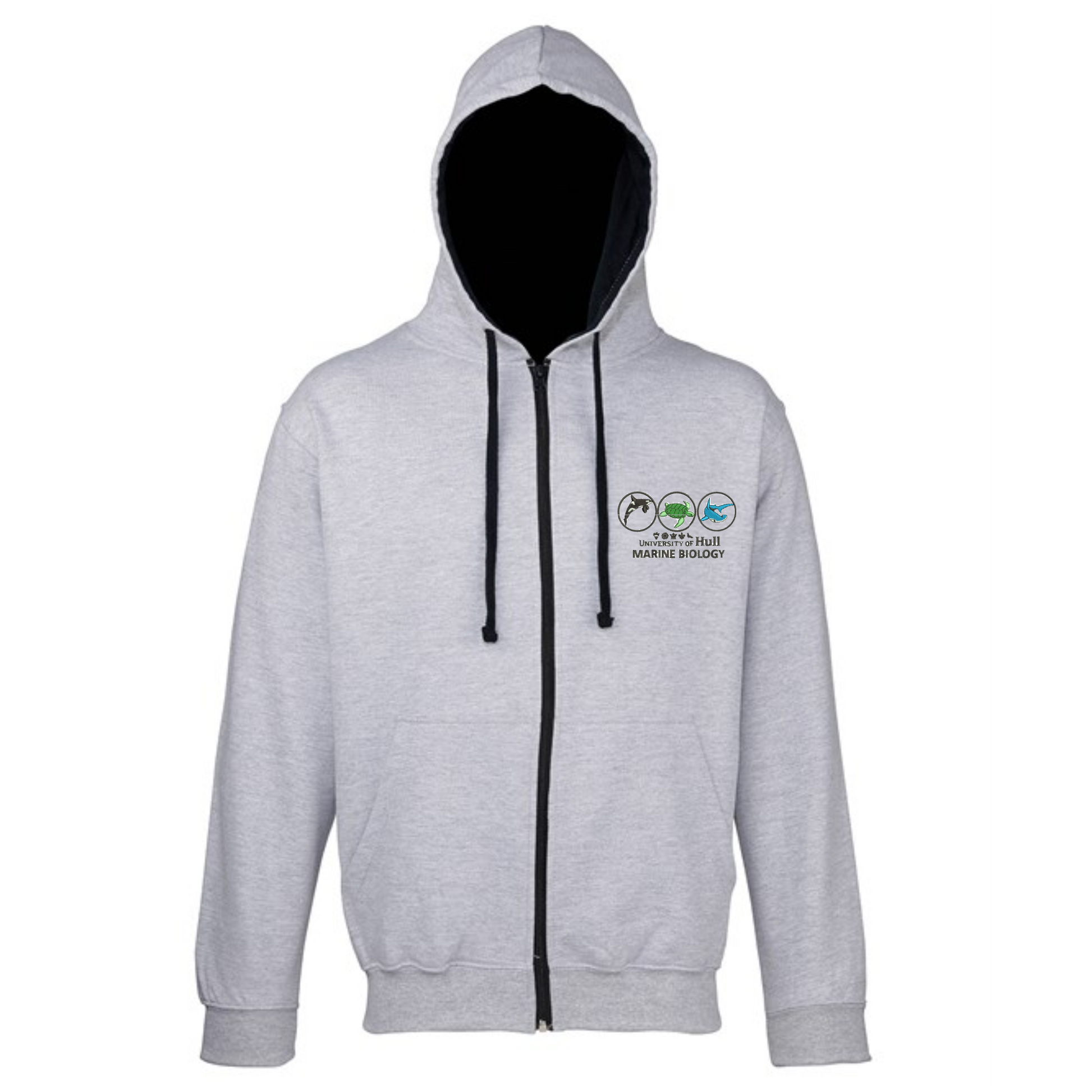 AWDis 2 tone varsity zoodie (zipped hoodie) with Marine Biology Dept. logo embroidered on.