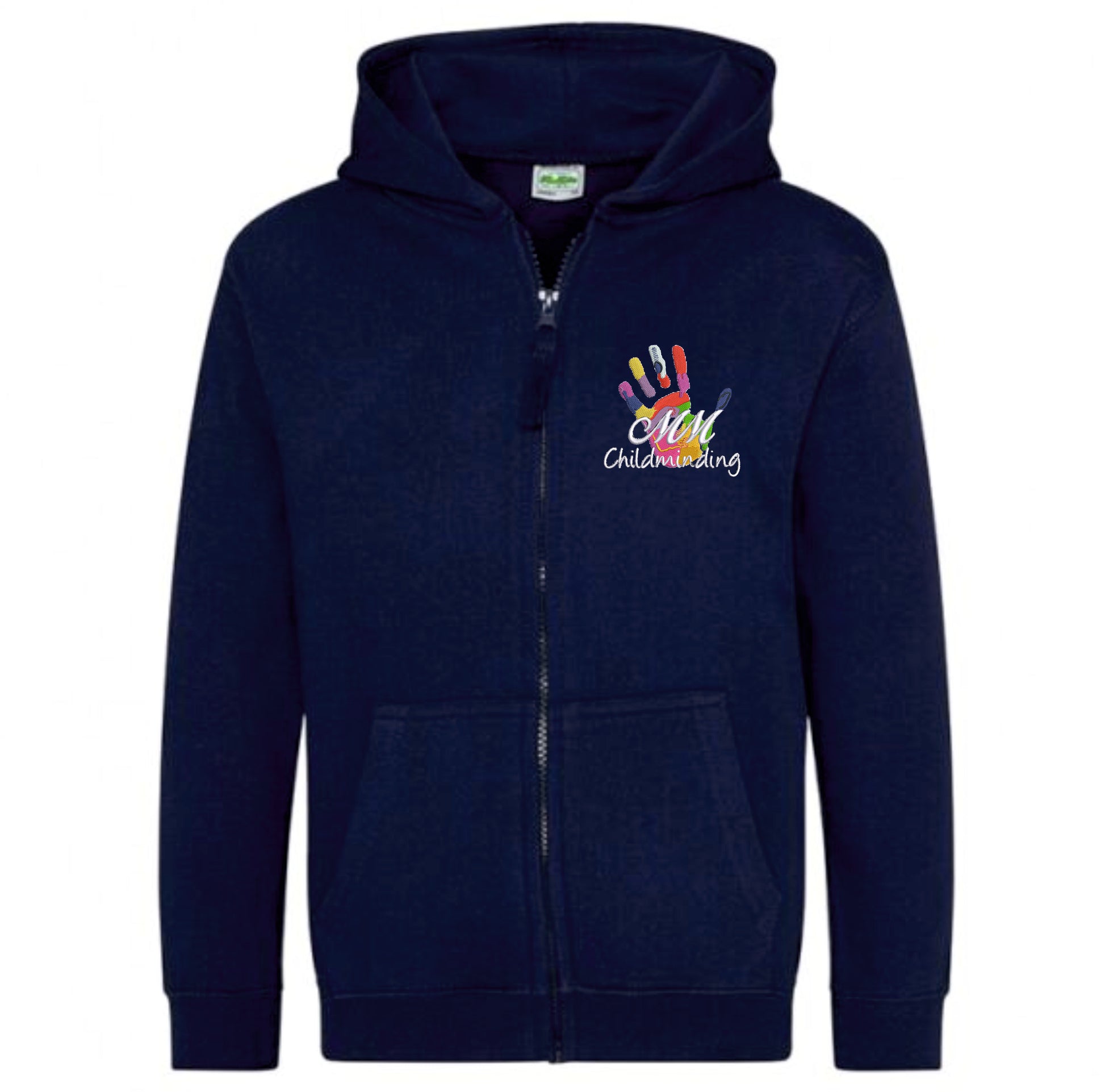 MM Childminding Navy Zip up Hoodie, comes with the logo embroidered on to the Left breast.