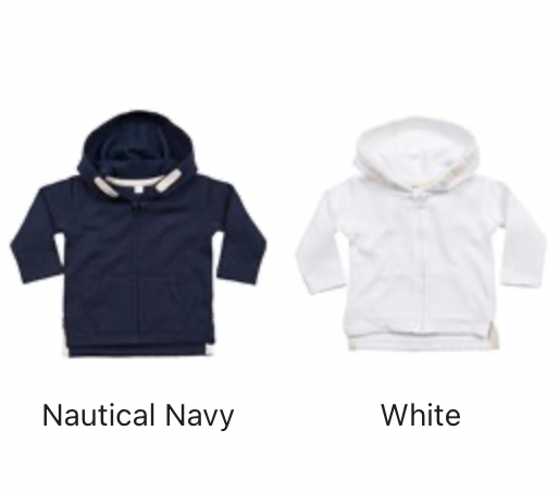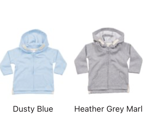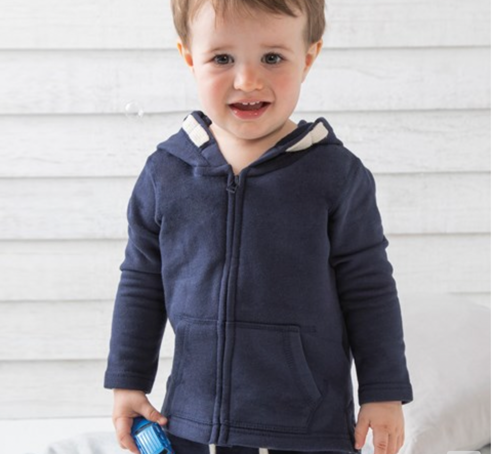 Soft and cosy baby zip through hoodie with straight hem and kangaroo pocket at front. 3-piece hood for better fit, with stylish and natural coloured mock-drawcord detail.