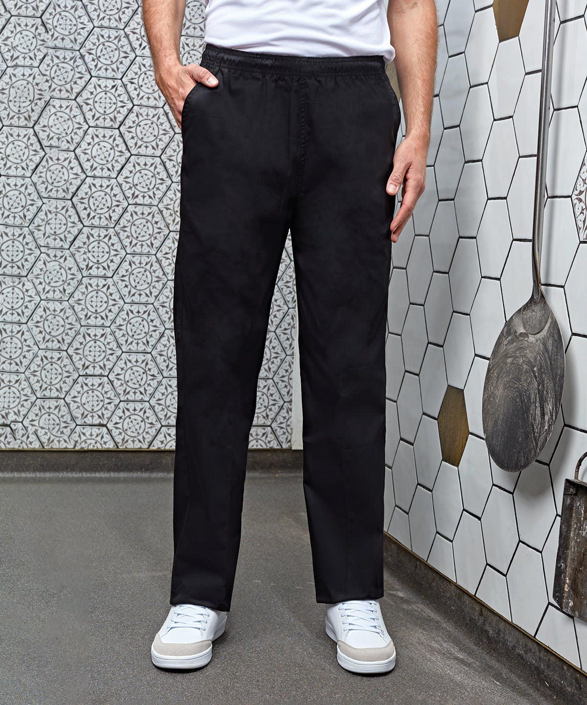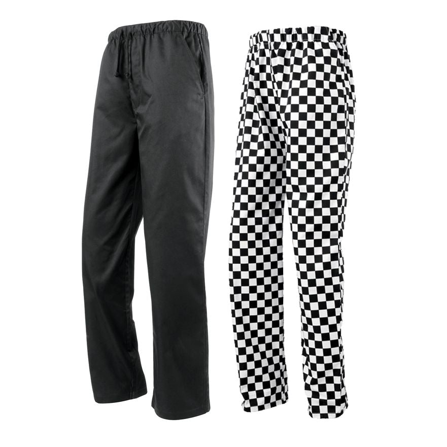Essential pull-on chef's trouser in available in two popular patterned styles seen to today's modern kitchens. The elasticated waist also has a drawstring for a more gathered, fitted style round the waist and there are two useful swing pockets to the side.