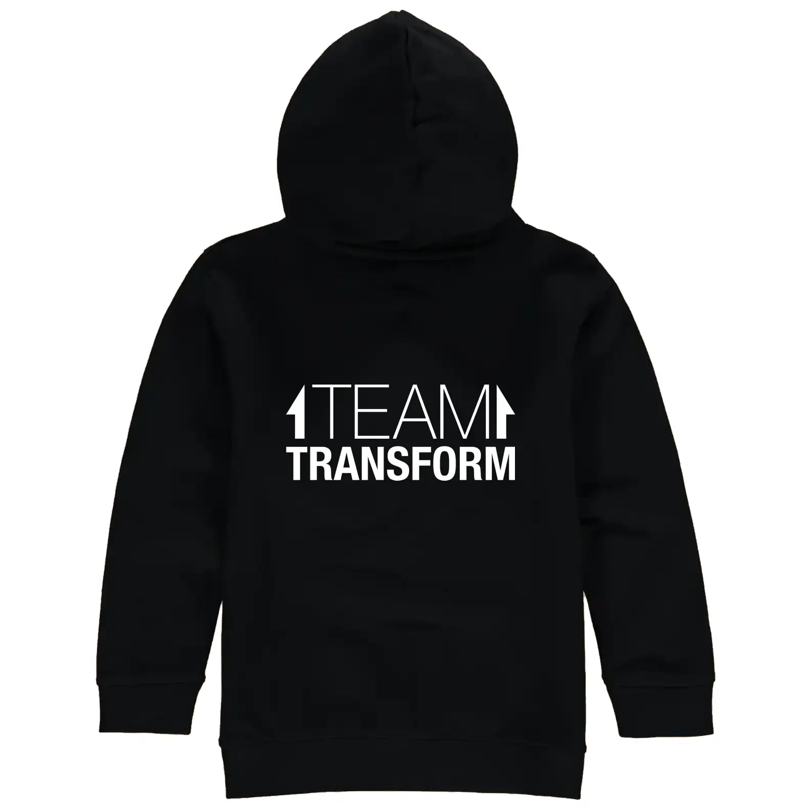 Team Transform kids pull over hoodie in black with Team Transform logo embroidered onto the left chest and print on the back.