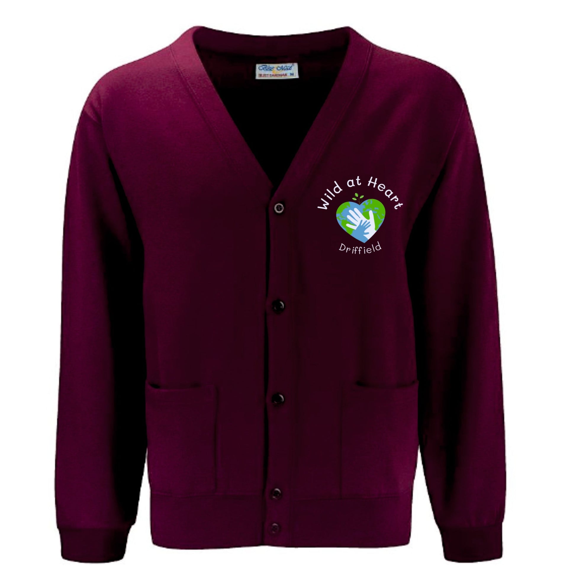 Burgundy Cardigan with the nursery logo embroidered onto the left chest.