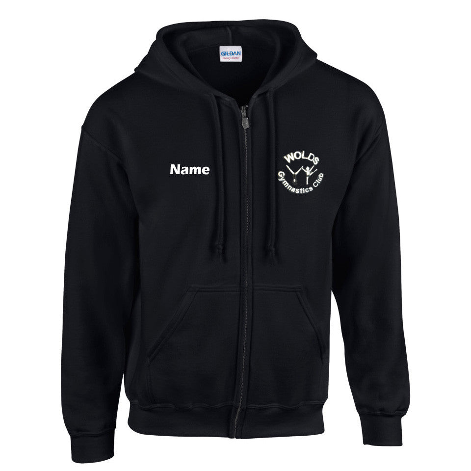 Black adult zipped hoodie (zoodie) with Wolds Gym logo on the front and back.