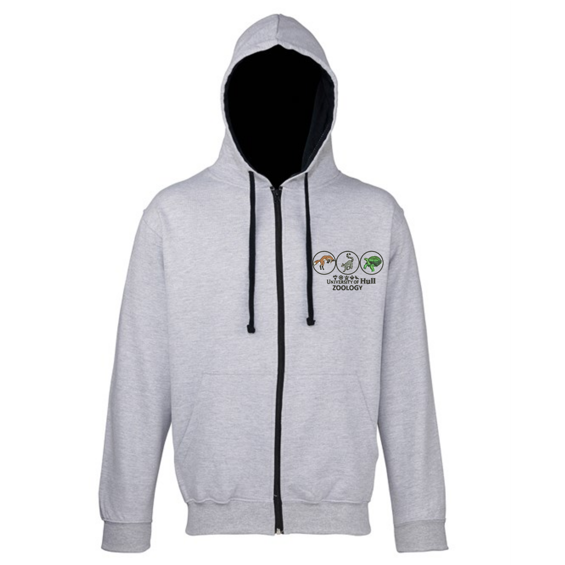 AWDis 2 tone varsity zoodie (zipped hoodie) with Zoology Dept. logo embroidered on.